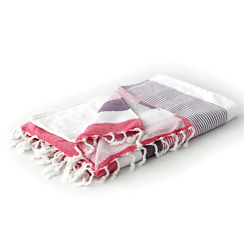 The sponge striped fouta with fuchsia color's is reversible and has a double face, one woven in soft cotton and the other in fine spongy cotton. Lightweight and ultra absorbent, you can use it as a sarong, beach or hand towel.<br>