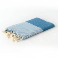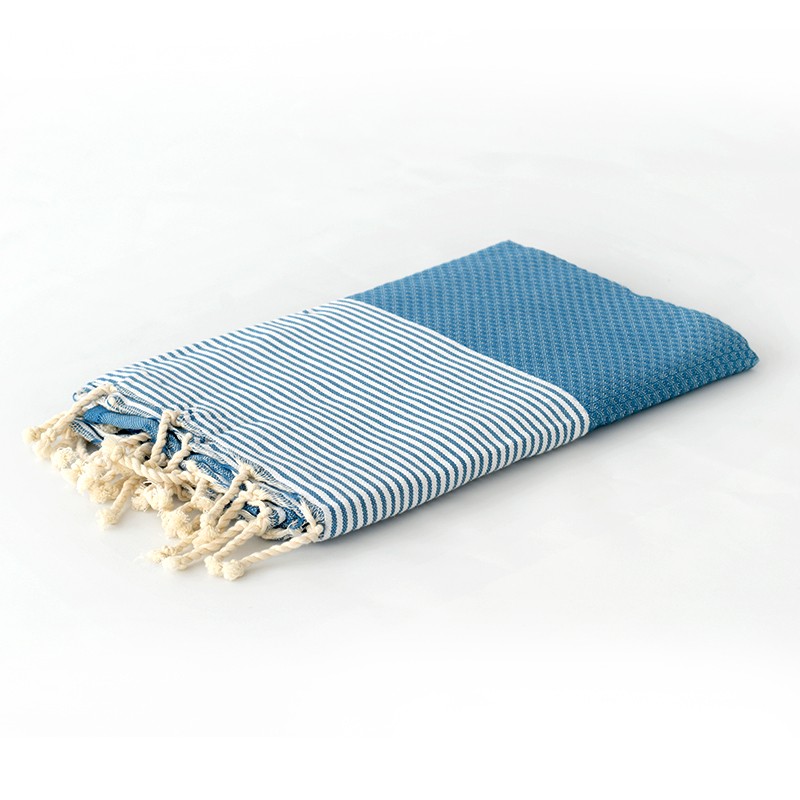 La Fouta Nid dabeille à petites rayures bleues est une Fouta artisanale, traditionnelle, avec un tissage spécial alvéolé, en relief avec de petites rayures blanches aux extrémités.Les franges sont tressées avec des mains habiles. 100% pur coton, Séchage ultra rapide
