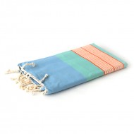 Optez pour la Fouta Enjoy à tissage plat avec 4 couleurs Bleu-Vert d'eau-Orange-Blanc et des rayures répétitives sur toute sa longueur.